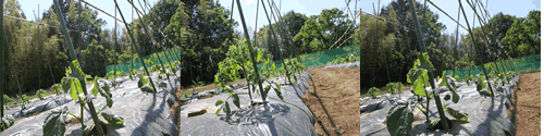 現在は、トマト、キュウリ、ナス、枝豆、ジャガイモ、ニンジン、ネギを育てています。社内研修でここを訪れ、近隣の方々のご指導を受けながら、草取りや作物の手入れをしながら大自然の恵みを感じています。
